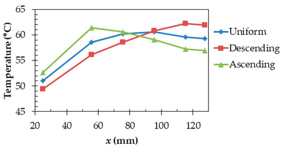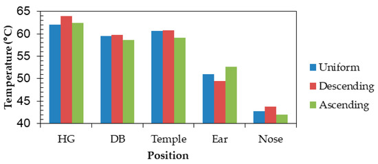 Figure 25 illustrates the position on the temple in the x direction. Figure 26 shows the temperatures at each position when power consumptions are uniform in descending order and in ascending order. For example, at 55.8 mm, temperatures for a uniform, descending order, and an ascending order are 58.6, 56.1, and 61.4 °C. The descending order is superior in that it can reduce the temperature near the ear.