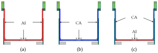 Illustration of frame materials: (a) Al, (b) CA, and (c) CA for the temple and temple tip and Al for others.