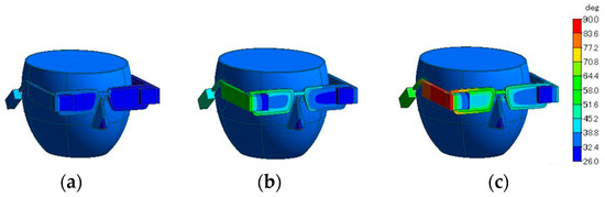 Figure 27 illustrates differences in the frame materials, where (a) is the all-Al frame, (b) is the all-CA frame, and (c) is the CA temples and temple tips and Al rims. Figure 28 depicts that Al greatly reduces temperatures of “HG,” “DB,” and “Temple,” whereas CA extremely raises the temperatures. The reason is thermal conductivity of Al is much higher than that of CA. However, the temperature of “Ear” is highest (51.0 °C) when Al was used but lowest (41.6 °C) when Al and CA were used. The temperature differences from the core temperature of 36.6 °C were 14.4 and 5.0 °C. The combination can suppress a temperature rise by 65.3% compared with Al only. For parts directly contacting the body, we found that a combination of CA temples and temple tips and Al rims is the best. The result obtained by a combination of Al and CA can satisfy the limit temperature (43 °C), which does not cause a low temperature burn [32]. Therefore, the method will be effective for the physical health safety and comfortable use of future smart glasses.