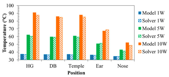 The accuracy of the proposed thermal network model was verified by a finite element method (FEM)-based 3D thermal solver. Figure 20 in Section 4 shows the result of errors at all nodes when power consumption was 5 W. Figure 29 shows temperature distributions obtained by a solver when power consumption varied. Figure 30 compares the model and a commercial solver in the temperature at the main nodes when power consumptions were 1, 5, and 10 W. We can see that differences in temperature between the model and solver hardly occur.