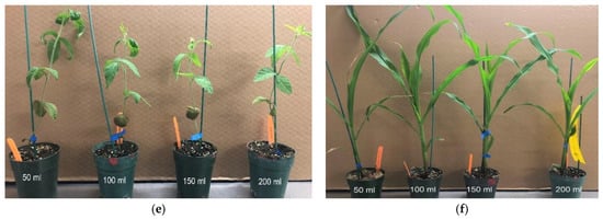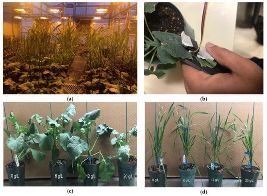 The experiment was conducted in two separate parts: an N experiment and a water experiment. The N experiment was conducted on a total of 64 plants consisting of commercially available canola (InVigor L140P), corn (P2702), soybean (S003-L3), and wheat (Stettler), with each having 16 pots. On the other hand, a water experiment was performed on separate 64 plants consisting of canola, corn, soybean, and wheat, with each having 16 pots. All the seeds were sown on 2 February 2019 in a controlled greenhouse environment situated at the Agriculture and Agri-Food Canada (AAFC), Saskatoon. The greenhouse conditions were set to 16 h day/8 h night, 23 °C day/ 18 °C night, 45% relative humidity. During the first three weeks, the plants were fertilized with slow-release 15–30–15 (15% nitrogen, 30% phosphorus, 15% potassium) fertilizer at a rate of 4 g∙L to ensure uniform establishment. Later, for the N experiment, the 64 pots were divided into four concentration levels ensuring equal distribution of plants from each species. Henceforward, only N fertilizer (30–0–0) was applied three times a week at four concentrations of 0 g∙L, 6 g∙L, 12 g∙L, and 20 g∙L. In the case of the water experiment, 64 pots were divided into four sections, with the same number of plants for each species for each section. After that, the water parameter was separated into four sections by applying it daily at a rate of 50 mL, 100 mL, 150 mL, and 200 mL. Figure 3a–f shows the greenhouse set-up and four different species of plants.