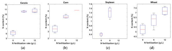Boxplot of leaf N content of (a) canola, (b) corn, (c) soybean, and (d) wheat. Here, the horizontal axis represents the rate of N fertilization in g∙L, and the vertical axis represents the N content.
