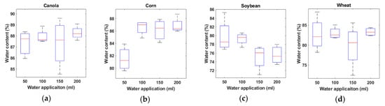 Boxplot of the leaf water content of (a) canola, (b) corn, (c) soybean, and (d) wheat. Here, the horizontal axis represents the rate of water application in mL, and the vertical axis represents the water content.