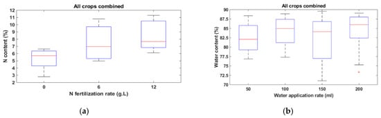 Boxplot of leaf (a) N content and (b) water content of all crops combined. The horizontal axis represents the rate of N fertilization in g∙L for (a) and water application in mL for (b), and the vertical axis represents the N content for (a) and water content for (b).
