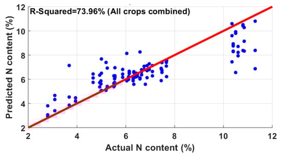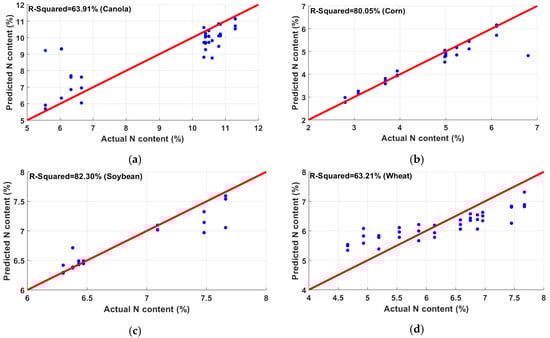 Correlation between the predicted N content and actual N content in (a) canola, (b) corn, (c) soybean, and (d) wheat. Soybean showed the best correlation of 82.3%, whereas wheat showed the lowest correlation (63.21%).