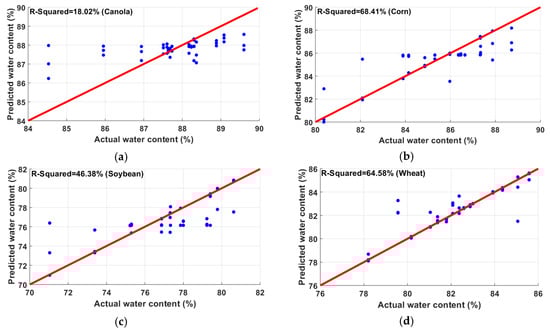 Correlation between the predicted water content and actual water content in (a) canola, (b) corn, (c) soybean, and (d) wheat. Corn showed the best correlation of 68.41%, while wheat showed a correlation of 64.58%; on the other hand, canola and soybean did not correlate well.