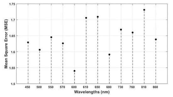 In this section, the importance of the features (wavelengths) was determined by calculating the increase in MSE of five-fold cross-validation after each feature was removed. For example, in the case of N determination, when the feature of 810 nm was removed and the whole regression analysis was performed with the 11 other features, the average mean square error of 10 runs was 1.7311. On the other hand, for the 600 nm wavelength feature, the MSE was 1.54, which was much less than for 810 nm. This means that the decrease in correlation performance by removing the 810 nm wavelength as the feature was much more significant than that achieved by removing the 600 nm wavelength. Hence, reflectance at the 810 nm wavelength is more important than that at 600 nm with respect to determining N. After performing the same technique on 12 wavelengths individually, the importance of wavelengths was as shown in Figure 12. It was found that the three most significant wavelengths, in this analysis, were 810 nm, 650 nm, and 610 nm. The same analysis was performed with regard to important wavelengths for determining water content in leaves. It was found that, when the 760 nm wavelength was omitted and the Gaussian process regression algorithm was applied with the 11 other features, the average (after 10 runs) MSE of five-fold cross-validation was calculated to be 22.9037. Similarly, the MSE of the other features was measured as shown in Figure 13. The most significant wavelength for water content determination was found to be 760 nm, followed by 730 nm and 860 nm in descending order. The significance of the other wavelengths was observed to be nearly similar.