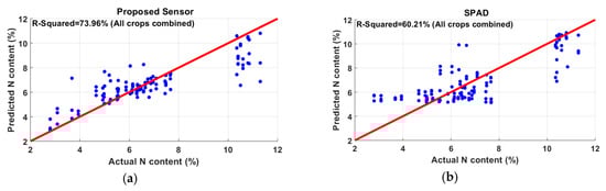 Comparison between (a) proposed sensor and (b) soil plant analysis development (SPAD). The proposed sensor showed a better correlation (73.96%) with N than SPAD (60.21%).