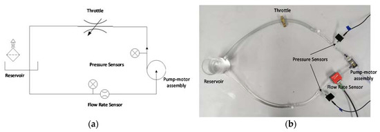 The training and test data sets were acquired from a circulation model (Figure 1) consisting of the miniaturized rotary pump, a throttle that varies the hydraulic resistance of the system, absolute pressure sensors (AMS4711-2000-A, Analog Microelectronics, Mainz, Germany) before and after the pumping unit and an ultrasonic flow rate sensor (SonoFlow co.55, Sonotec, Halle, Germany). The system was supervised by a custom LabVIEW (National Instruments, Austin, Texas, USA) program and a real-time microcontroller (cRIO-9074, National Instruments, Austin, TX, USA). The data was stored with a sample time of . An analog low pass filter was implemented before the analog to digital converter stage with a cut-off frequency of 1.6 Hz. The custom-built 3D printed pumping unit was driven by an ECX-8 motor (Maxon Group, Sachseln, Switzerland). The data post-processing, evaluation of results and training and optimization of the GPR was done in MATLAB (MathWorks, Natick, MA, USA).