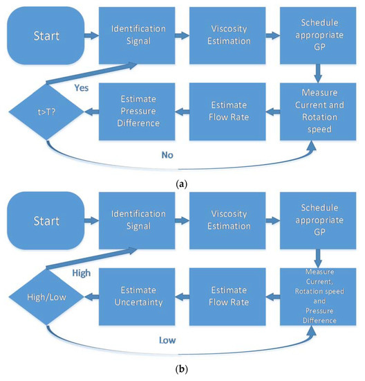Two algorithms for online estimation are proposed whose flowcharts are shown in Figure 2. For the first one (Figure 2a) the system starts by acquiring an identification signal which is then used to estimate the viscosity of the liquid. After that, a scheduling function enables the GP models which are most appropriate for the estimated viscosity levels. Then, the rotation speed and current of the motor are measured and used as inputs of the GP models that estimate the flow rate and the pressure difference. When a predefined time has elapsed, the identification signal is measured, and the viscosity is estimated to switch to the most appropriate GP model.