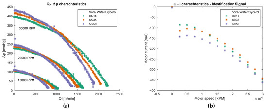 As a first step of the system identification process, the characteristic curves of the custom-built pump were measured with different water–glycerol mixtures. Three clusters can be seen in the plot of Figure 3a, which corresponds to the Q–△p characteristics of the pump at different motor speeds—15,000, 22,500, and 30,000 RPM. The color coding corresponds to 85%, 65% and 50% water volume in the water–glycerol mixtures that have different viscosity. The Q–△p curves at equal motor speed start parallel at low flow rates. Then, after some viscosity dependent flow rate, the higher the viscosity the steeper the curves become. The Q–△p curves represent the hydrodynamic behavior of the system which is the part of the system to be estimated.