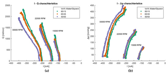 (a) The I–Q characteristics of the system; (b) The I–△p characteristics of the system. The three clusters of curves in both plots correspond to different motor speeds while the color coding refers to different viscosities of the test liquid.