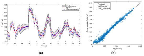 Results of the flow rate prediction. The estimation is done with a model that is trained on the same viscosity as the test signal. (a) Time series of the true and predicted flow rate with confidence intervals; (b) A scatter plot with fitness measures of the estimated vs. measured flow rate.