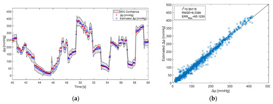 Results of the pressure difference prediction. The estimation is done with a model that is trained on the same viscosity as the test signal. (a) Time series of the true and predicted flow rate with confidence intervals; (b) A scatter plot with fitness measures of the estimated vs. measured pressure difference.