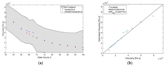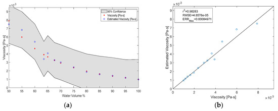 The viscosity of the liquid was estimated by sending the identification signal through the pump, measuring the electric current and motor speed and using those as inputs to a GPR model, which then predicted the viscosity. A result of the estimation can be seen in Figure 7 with some measures for fitness. All viscosity values at multiples of 5% volume have been part of the training of the model, while the liquids at 33% and 36.5% volume are unknown to the model. The overall correlation coefficient for the estimation of viscosity was r2 = 0.98, while RMSE = 0.11 mPa.s and ERRmax = 0.77 mPa.s. If the 33% and 36.5% water volume fraction liquids are also included in the training process, the estimation error improves to RMSE = 0.049 mPa.s. The results of the improved estimation can be seen in Figure 8.