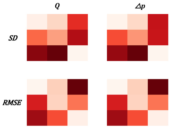 Illustrating the correlation between standard deviation and root mean squared error of the prediction. The left column of matrices shows the results for flow rate and the right column for pressure difference. The top row shows the matrices for standard deviation and the bottom row for RMSE. The matrices themselves show results for the 3 presented liquids thus far the 506,585 volume percentage water in the water–glycerol mixture. The diagonal values correspond to predictions , with i = j, while off-diagonal values correspond to , with i ≠ j. It can be seen that in both RMSE and standard deviation (SD) the diagonal values are much smaller than the off-diagonal values.