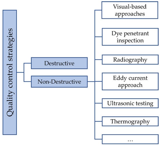 Quality control is a crucial aspect in the industrial production line. Several approaches are currently used to assess the quality of a product or the outcome of a process. Depending on the method employed to identify a defect on a surface/volume, quality control strategies can be classified as destructive or non-destructive, as shown in Figure 1. Non-destructive testings (NDTs) aim at monitoring a component to detect a defect without extracting samples from it, or permanently damaging it. Mostly used in the aeronautic field, NDTs are classified as: visual-based method, dye penetrant inspection, radiography, ultrasonic testing, eddy current approach, and thermography [1].