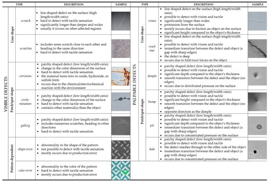 The category of visible defects contains defects that are hard or almost impossible to be localized by touch. The category of palpable defects contains defects that are significantly easier to be localized with the combination of vision and touch. Clearly, the naming of categories does not mean that there are no exceptions in either category.