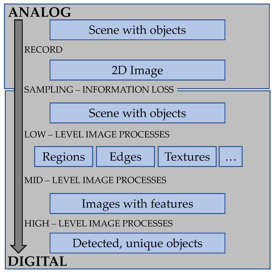 The theoretical levels of image representation for image analysis. The transformation from the analog to the digital domain (with sampling) always results in some information loss.