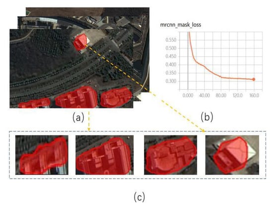 Building extraction based on Mask R-CNN. (a) The whole building extraction; (b) Loss function curve; (c) The single building extraction.