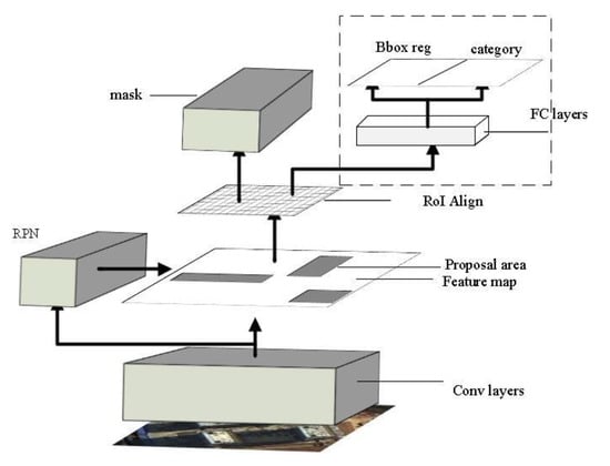 Mask R-CNN models have made remarkable achievements in the field of image segmentation. Compared with the single-stage convolutional neural networks, Mask R-CNN has higher precision in image segmentation. The architecture of the model is shown in Figure 4. In the original image, the multi-layer convolutional neural network is used to obtain the high-dimensional feature map, and candidate regions are extracted by RPN. The corresponding position offset between the feature maps in Faster R-CNN and the original map is solved by using the pooling layer ROI align based on the bilinear interpolation algorithm. In addition, the model achieves object segmentation by fully convolutional networks as a branch.