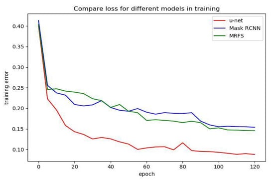In order to analyze the effect of three convolution neural network models, we compared the loss function curves of u-net [7], Mask R-CNN and MRFS. As shown in Figure 8, we record the training error every five epochs and plot the loss function curve.