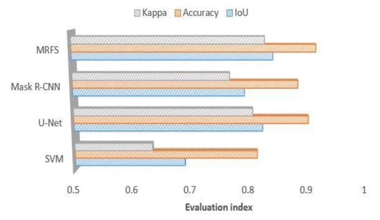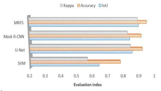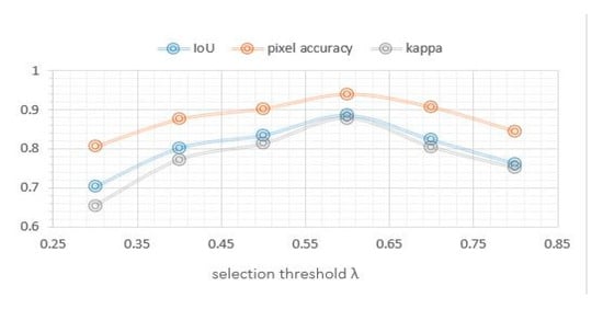 In order to analyze the influence of the parameters of the MRFS, this paper carries out a number of experiments by changing the object selection threshold parameter λ. The values of λ are set as 0.3, 0.4, 0.5, 0.6, 0.7 and 0.8, respectively. Figure 14 shows the changes of IoU, detection accuracy and kappa with the threshold parameter λ. In this experiment, λ is in the range of [0.4,0.6], and the change of each index is relatively small.