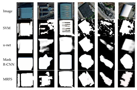 Figure 12 shows that the convolutional neural network performs poorly in edge extraction and the integrity of the object but the MRFS can deal with such problems more effectively. Figure 13 shows the extracted results of the single building objects after enlargement. Compared with convolution neural networks, the support vector machine has better edge segmentation, but misses some areas of complex buildings. For Mask R-CNN, u-net and MRFS proposed in this paper, the convolutional neural network has better efficiency to locate buildings in complex areas.