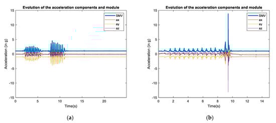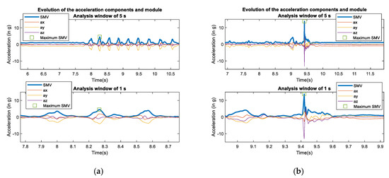 - The series of the acceleration modules (SMVj) computed from the samples collected during the observation window:where fs indicates the sampling rate of the accelerometer and TW represents the duration (in seconds) of the window.