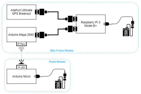 Seen as a black box, the entire hardware scheme is described in Figure 2, making it easy to observe the way modules communicate with each other. The module blocks are highlighted with blue dotted lines. The communication between the Arduino Mega, Raspberry Pi and the GPS module is realized via USB (for the GPS module, an UART to USB converter was attached). Furthermore, because there are two rotating joints from the pedal to the bicycle’s frame, making it harder to use wires, the infrared transmission medium was chosen for its simplicity and robustness. The downside of this approach was the addition of another microcontroller and an extra battery to power it.
