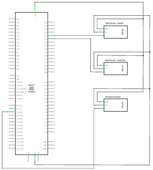 This module is used to determine the speed, cadence and rider’s power during the ride activity. All this data is serialized and sent via USB to the Raspberry Pi, which acts as a master of the entire system, but also as an internet gateway. Being also a standalone module, it is powered by a rechargeable battery. The wiring diagram is presented in Figure 4.