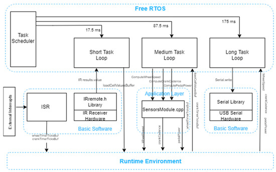 - Basic Software—this level is dedicated to hardware interaction between the microcontroller and its connected peripherals. Here can be found the libraries used to interface the sensors and drivers and also the interrupt service routines