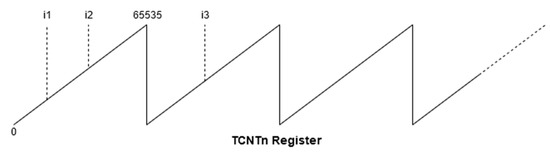 In order to compute the speed and cadence, the timers four and five are used. When initialized, the timers are configured to use in normal mode and the capture mode is activated. This means that each timer will increment the TCNTn (Timer Counter Register n = 4, 5) starting from 0 to the maximum value of 65535, and once it reaches this value, the register is reset. Each timer has an allocated pin for the capture mode (pins 48 and 49). Thus, by enabling this mode, the pins’ functionality is also changed, allowing them to trigger interrupts on events such as a Hall Effect sensor’s impulse, capturing the TCNT’s current value in a separate register ICR (Interrupt Capture Register), and an interrupt service routine is dispatched. The timer’s working principle is presented in Figure 7, presenting a normal mode of operation and three interrupts on Interrupt Capture Pin.