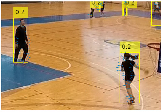 Different techniques and actions that players perform, as well as the frequent changes of position and occlusions, cause the shapes and appearances of players to change significantly during the game, which makes the detection and tracking process more challenging. The indoor court environment with relatively reflective floors is often illuminated with harsh lighting so that the shadows and reflections of players are usually present on the recordings and, due to the speed of action performance, motion blur occurs, which further complicates the tracking and detection problems. Additionally, the positions of the player and the distance to the fixed-mounted camera are constantly changing, so that players can be close to the camera, covering most of the image, or at a distance from the camera and occupy just a few pixels. The ball is also an important object for recognizing the handball scene, but it is even more complex to detect and track than the player, because it is even smaller, moves quickly, in different directions, and it is often covered by the player’s body or not visible because it is in the player’s hands [