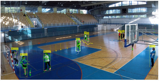 First, the players are detected in the input video while using a CNN-based object detector. Here, the YOLOv3 detector pre-trained on the MS-COCO dataset was used to mark the players on each frame of the video sequence with their bounding boxes (