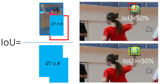 39]. The detections are considered to be true positive when the intersection over union of the detected bounding box and the ground truth box exceeded the threshold of 0.5. The intersection over union measure (IoU) is defined as the ratio of the intersection of the detected bounding box and the ground truth (GT) bounding box and their union, as in