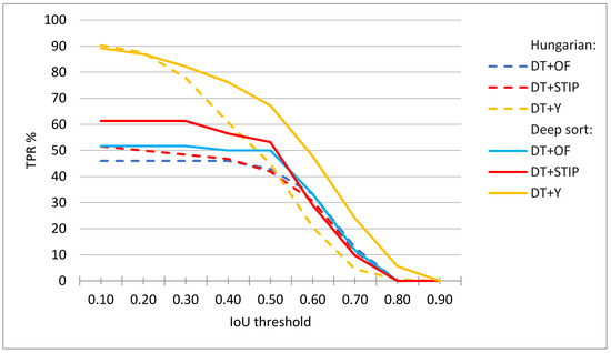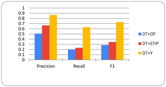 Figure 13 shows the evaluation results for all activity measures and indicates significantly higher values for the DT+Y activity measure. The DT+Y achieves the best F1 score of 73%, which is significantly better than the results that were achieved by other measures. DT+OF has a precision of 51%, a DT+STIP of 67%, and DT+Y of 87%. All of the measures achieve lower recall scores than precision scores, DT+OF achieves only 20%, DT+STIP 23%, and DT+Y 63%; however, this is an even more significant difference in DT+Y performance when compared to other measures.