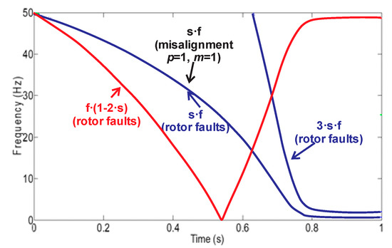 Equations (1)–(4) suggest that the harmonics related to the fault depend on the motor slip, so that it is possible to observe their development during the transient startup, where the slip starts at a maximum value when the motor is not running, and reaches a minimum value in the steady state. According to Equations (1)–(4), the theoretical patterns expected during the transient start-up in the case of broken rotor bars and misalignments can be seen in Figure 2.