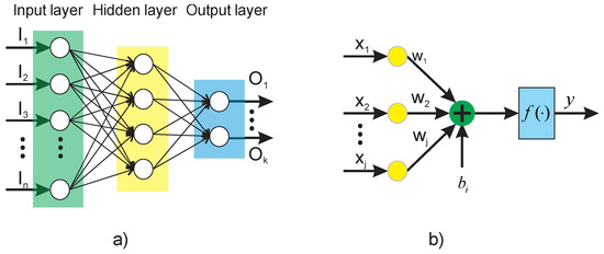 Artificial neural networks (ANNs) are computational models capable of solving classification and pattern recognition problems through complete algorithmic structures [37]. Among the most common ANN architectures, feed-forward neural networks (FFNN) have been widely used as this model is very simple and practical, and in computational terms, its calculation represents a very low burden. Moreover, this neural network structure facilitates the possibility of generating automated results by generalizing suitably about the data with which it is trained. FFNN have found applications on solving classification problems and approximating real-valued functions. The most general structure of FFNN is composed by a layered architecture having essentially one input layer, one or more hidden layers, and one output layer, as shown on Figure 3a, where Ii are the inputs of the FFNN and Oi correspond to the outputs of the model. Each layer has one or more elementary units called neurons, whose processing capability is stored in the connections by synaptic weights, and whose adaptation depends on learning [38] (see Figure 3b). The mathematical model of each neuron is given by Equation (5), where y is the output of the neuron, wi are the synaptic weights, xi are the inputs of the neuron, b is the bias, f(·) is the activation function, and n is the total number of inputs.