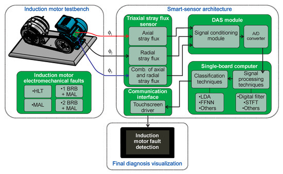As has been shown by the results, the smart-sensor proposed here is capable of capturing and processing the different stray flux signals found in the induction motor frame: axial, radial, and the combination of both from a single triaxial stray flux sensor. This enables the proposal to reliably detect and diagnose diverse electromechanical faults.
