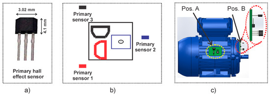 The main triaxial stray flux sensor is essentially made up of the integration of three individual hall-effect primary sensors, such as the one depicted in Figure 6a. Each of the primary sensors are ALLEGRO ™ microsystems brand, model A1325, having a sensitivity of 5 mV/G. This sensor is 3.02 mm wide by 4.1 mm high, it has an output voltage proportional to the magnetic flux density, low-noise output, wide ambient temperature range: −40 °C to 150 °C, is immune to mechanical stress, and complies with other characteristics as indicated by the manufacturer in their respective data sheet. The primary sensors are located on a perpendicular axis to each other in order to capture the axial, radial, and the combination of the axial and radial stray flux components regardless of their relative location to the motor frame. Figure 6b shows a schematic view of the triaxial stray flux sensor proposed here. The relative positions of the three primary sensors can be observed. In this regard, if the sensors are installed in position A shown in Figure 6c, primary sensor 1 mainly captures the axial flux, primary sensor 2 captures the combination of the axial and radial flux, whereas primary sensor 3 captures the radial flux. Similarly, if the sensors are installed in position B shown in Figure 6c, primary sensor 1 mainly captures the combination of the axial and radial stray flux, primary sensor 2 captures the axial flux, and primary sensor 3 mainly captures the radial stray flux. The main advantage of this sensor is that it can be virtually located anywhere on the frame of the machine in such a way that it still will be able to capture the different stray flux components.