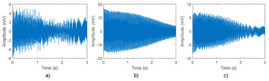 Time–domain signals captured by the proposed triaxial stray flux sensor: (a) axial stray flux; (b) combination of the axial and radial stray flux; (c) radial stray flux.