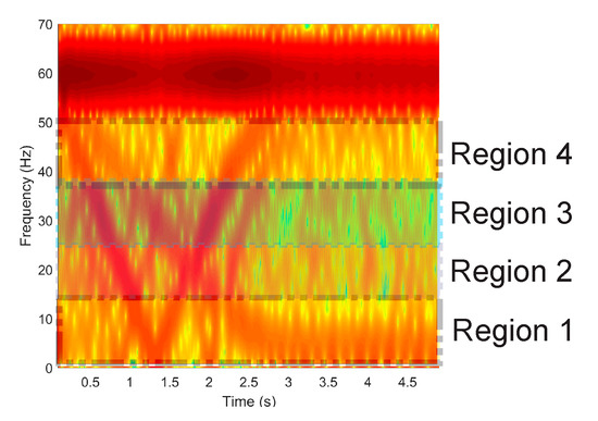 In the first stage of the signal processing, the axial, radial, and combination of axial and radial stray fluxes are obtained through the triaxial stray flux sensor. Subsequently, the time–frequency maps of the startup transient are computed using the STFT with a hamming window having a time length of 1024 data points, which, at the sampling frequency used (5 KHz), is 0.2048 s wide, and the hop size used between windows is 256 data points, which represents a 75% overlap, while 1024 points were used for the calculation of the FFT for each window. This gives a frequency resolution of approximately 4.88 Hz and a time resolution of 51.2 ms. These parameters are chosen with the purpose of having a good resolution in time as the transient startup in electric motors is a variable parameter that depends highly on the motor load. Once these maps are obtained, they are subdivided into four regions of interest, which cover a bandwidth below the fundamental power supply component (60 Hz) because, in this region, the majority of harmonics of greater interest (linked with the considered faults) evolve during startup. The following frequency bands or regions were considered: region 1 (~[0–13] Hz), region 2 (~[13–26] Hz), region 3 ((~[26–39] Hz), and region 4 (~[39–52] Hz), as shown in Figure 8.
