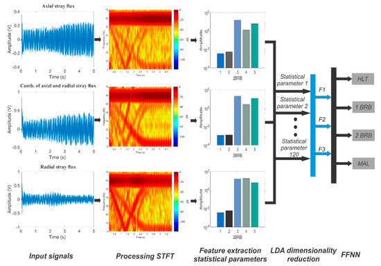 Block diagram of the proposed smart–sensor. BRB + MAL, broken rotor bar + misalignment; HLT, healthy motor; DAS, data acquisition system; A/D, analog/digital; STFT, short time Fourier transform; LDA, linear discriminant analysis; FFNN, feed–forward neural network.
