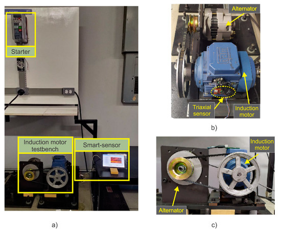 Experimental setup: (a) Induction motor testbench, (b) side view of the testbench, (c) front view of the testbench.