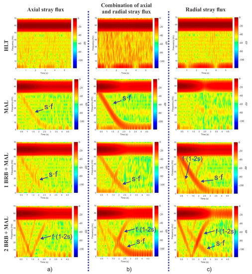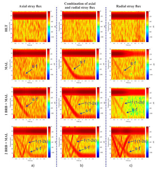 - Sideband harmonics appearing in the radial stray flux component that are also seen in the spectrum of the steady-state current [22,32]. These components follow Equation (3).