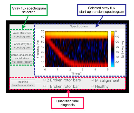 The interface that shows the results delivered by the smart-sensor to the end user are shown in Figure 15. The interface is divided into three main windows: the one on the left side shows the buttons that select the type of signal to obtain the time–frequency map (axial, radial, or the combination of both stray fluxes); on the right hand side, the spectrogram graph calculated using the STFT of the selected stray flux is located; and in the lower part, the final result obtained through the proposed automated diagnosis is found, which indicates the healthiness state of the machine by selecting from the menu of possible failures to diagnose (HLT, MAL, 1 BRB, and 2 BRB) that are present in the motor under analysis.