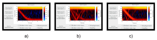 STFT analyses obtained for each one of the induction motor faults studied here when processing the signals provided by the triaxial stray flux sensor when installing it in position A: (a) primary sensor 1; (b) primary sensor 2; and (c) primary sensor 3.