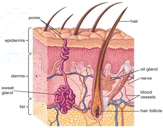 - Montagna, W.; Ebling, F.J.G. Human Skin. Encyclopædia Britannica, Inc., 11 April 2016. Available online: https://www.britannica.com/science/human-skin (accessed on 18 November 2019).