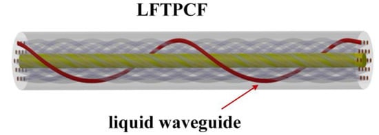 Torsion measurements based on optical fibers have been applied to many fields including robotics, manufacture industry, and civil engineering. There are many different fiber structures that can be used for torsion sensing including long-period fiber gratings [1], optical fiber interferometers [2], fiber loop mirrors [2,3], and cascaded dissimilar fibers [4]. However, their inherent symmetry prevents discrimination of the rotational direction, unless extra pre-twist is applied on fiber sensors, which limits their practical applications. Thus, it is necessary to break the symmetry of fiber devices to construct sensitivity-improved torsion sensors while maintaining their direction discrimination. In recent years, helical structures have been implemented in optical fibers to demonstrate novel strain sensors [5], twist sensors [6,7,8], and tunable filters [9]. Some of these devices have been realized by employing photonic crystal fibers (PCFs) [10,11,12,13] and exhibited good torsion-sensing characteristics as well. Moreover, as is well-known, the unique arranged air holes in the cladding of PCFs provide flexible platforms for optical material infiltration and enable the creation of embedded satellite waveguides [14,15,16]. Therefore, ingenious directional coupling could be designed and tailored between the core mode and the embedded waveguide modes, and many interesting sensing properties can be obtained by tuning the effective refractive index (RI) of the waveguide modes. As such, with combining the helical structure and the liquid-filled waveguide in PCF cladding, sensors with superior sensing performances can be developed readily. Recently, we have proposed and demonstrated a torsion sensor based on a liquid-filled helical PCF (LFTPCF), which presents very high sensitivity and definite direction discrimination simultaneously for torsion measurement [17]. However, the response mechanism of the torsion sensitivity to initial twisting rate and the refractive index of the filled liquid has yet to be investigated.
